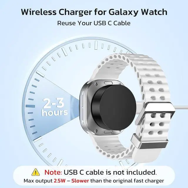 ? (USB-C Simplicity No Extra Cables Needed) This charger turns any USB-C cable into a dedicated Galaxy Watch chargerno proprietary cords no bulky docks. While charging is capped at 2.5W and slower than the original charger it still offers a practical lightweight solution for everyday use and travel. Ideal for minimal setups and staying powered on the go.? Not compatible with Galaxy Watch (2018) Gear S2/S3 or Galaxy Fit/Fit 2.? (Cooler Charging with Built-In Safety) Redesigned contact surface improves thermal management and charging efficiency. Combined with an advanced safety chip the charger protects against overheating overcharging and short circuits.