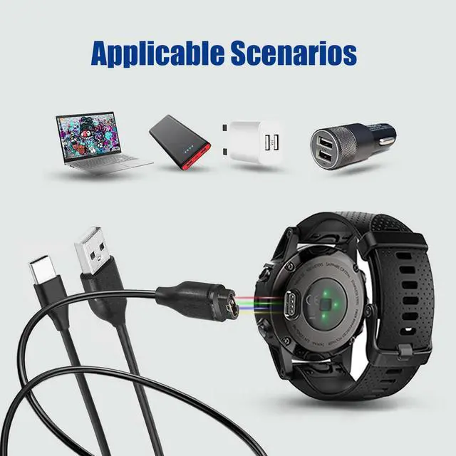 USB-C & USB-A Dual Charging for Garmin WatchesThis garmin watch charger cable includes both USB-C and USB-A connectors making it compatible with modern USB-C ports as well as traditional USB-A chargers. Works reliably with Fenix Forerunner Venu Vivoactive Instinct Epix Approach and more delivering stable power for everyday charging at home work or travel. 3.3 ft / 1m Practical Length Longer Than OriginalEach garmin charger cable measures 3.3 ft (1m) offering more flexibility than the original short cable. Ideal for desks bedside tables power banks and car chargers without being restricted by outlet placement. Safe & Efficient Charging PerformanceBuilt with smart protection chips this garmin watch charger delivers stable current while preventing over-voltage overheating and short circuits.