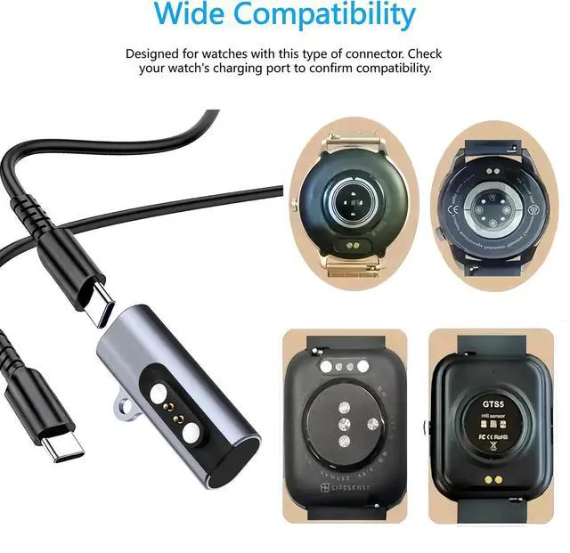 (Note: Only 1 of the 2 Charging Adapter is compatible with your Smart watch)USB-C to 2-Pin Charging AdapterEasily convert any USB-C cable into a dedicated charger for your Smart wearable. Works with all standard USB-C cables and power sources for convenient charging anywhere. Features a clear blue LED indicator that shows real-time charging status and power levelseasy to see even in low-light conditions. Portable & User-FriendlyCompact and lightweight design complete with an attachment lanyard for easy cable management. Secure the adapter to your favorite USB-C cable and take it anywhereperfect for bags cars or pockets. Never misplace your charger again! Fast & Safe Charging Built-in over-voltage and over-current protection Aluminum alloy housing improves heat dissipation. Typically achieves a full charge in about 2 hours with stable and efficient power delivery. Support & Suggestion Not sure if this charger fits your device? Send us a photo of your original charger or your devices charging contacts. Our support team will help confirm compatibility and guide you to the right model!