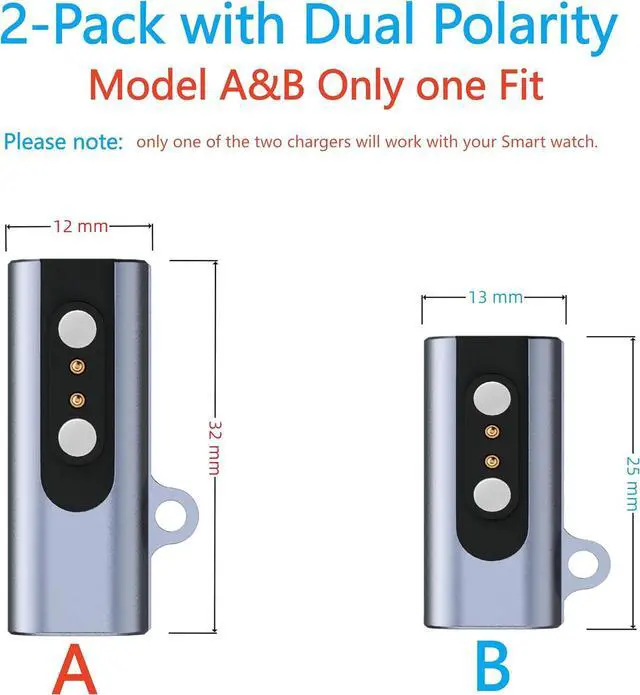 Model A&B One fit: To ensure that the Charger can charge your watch we will send you two Charger [Model A (S+N) and one Model B (S+- N)] with opposite polarity. Only one charger is compatible. If the Model A Charging Adapter does not support your watch please try a Model B Charging Adapter.
