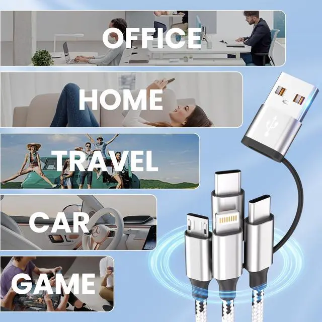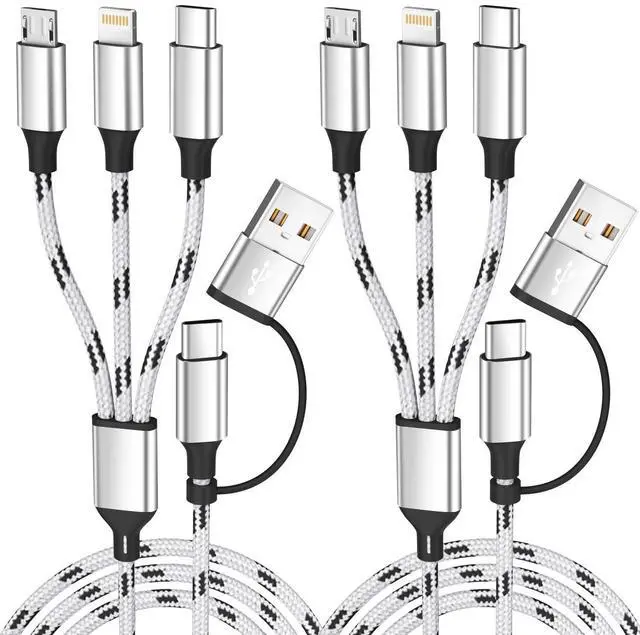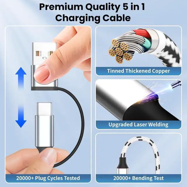 Length]: Combine USB A+USB C with Micro USB+Type-C+Lightning as well as 5FT length is suitable for travel car office home party business and so on. The nylon braided 5-in-1 universal charging cable is very easy to fold and can be placed in handbags laptop bags pockets and more. Multiple ports allow you to charge multiple devices at the same time without having to use multiple cables[Charging&Data transfer]: Our multiple charger cord is made of high quality tinned copper material and chips. Compared with pure copper it ensures more stable and safer charging prevents overheating during the charging process and extends the cable's lifespan. It can deliver up to 3A of the fastest available current. (Total current not per end).