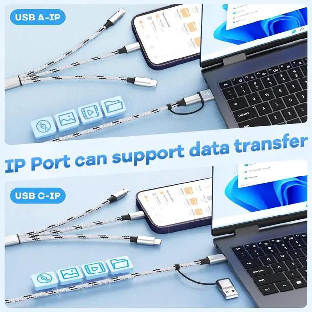 1. Only For IP port supports charging and data transfer other Micro and USB C ports support charging only. 2 Actual charging speed depends on your device and wall charger[Durability&Flexibility]: With sandblasted aluminum housing and one-piece plug tested to 20 000+ insertion and removal cycles. The military-grade nylon-braided usb c multi charging cable with special stress relief design can withstand 20000+ Bending test. The tinned copper material has better corrosion and oxidation resistance which ensures stable charging effect and prolongs the life of the charging cords. Upgraded laser welding technology ensures that the plug will not come off easily[Universal