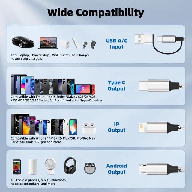 Compatibility]: The multi chargers for all devices compatible with Phone 16 15 14 13 12 11 Pro Max / 16 15 14 13 12 11 Pro / 14 13 12 Mini /16 15 14 Plus / 16 15 14 13 12 11/ SE / Xs Max / Xs / Xr / X / 8 Plus / 8 / 7 Plus / 7 / 6s Plus / 6s / 6 Plus / 6 / 5 / 5s Pad Air / Pro Pod / Galaxy UItra/ S24+/ S24/ S23+/ S23/ S22+ / S22 / S21+ / S21 / S20+ / S20 / 210+ / S10 / S9+ / S9 / S8 / Note 7 8 9 10 20 and other Android devices for most mobile phone charging