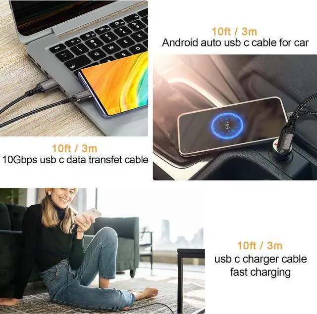 USB C Cable: With this 10ft USB C charging cable you can charge your device in the office or in the back seat of your car for long distance use while lying comfortably in bed or on the sofa.