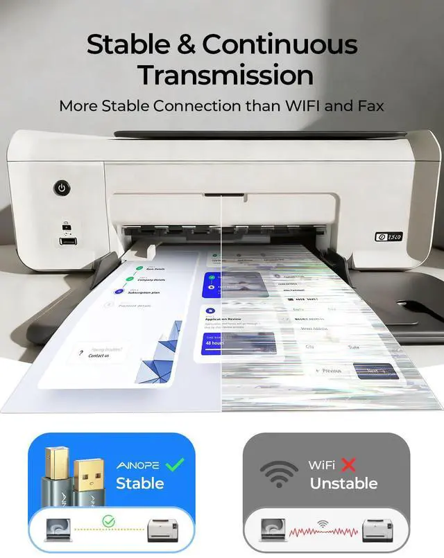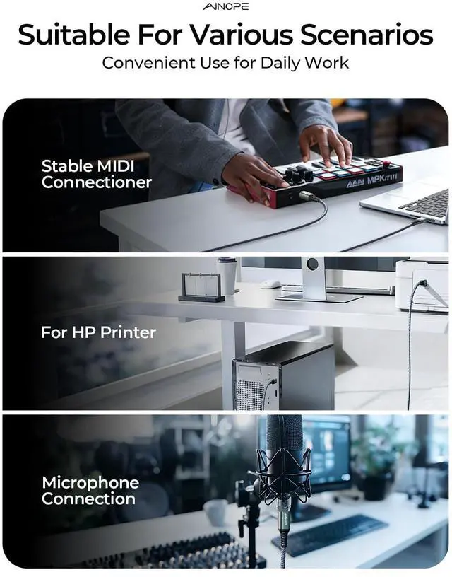 The AINOPE USB B to USB A 2.0 cable is compatible with popular printers like HP Deskjet 2540/3630 Canon MG5750 Epson XP225 Brother DCP-L2520DW and more. It also doubles as a MIDI cable to USB ideal for connecting keyboards synthesizers and music equipment to your computer. Whether you're printing documents or composing music this USB-to-USB cable ensures stable high-speed data transfer for reliable performance in any setting.: AINOPE CARE PROMISEAINOPE is a brand focused on USB cables. Backed by a 12-month responsive support suitable for both individual buyers and business accounts purchasing through Business. *Bulk-Ready for Office & Business UseOrder in business quantities to equip multiple workstations with a standardized USB printer cable solution. Whether you're outfitting a small department shared desks or conference rooms this durable high-speed cable makes deployment simple and consistent across your team. No compatibility confusion. No connection drops. Just reliable plug-and? print performance designed for real? world office environments.