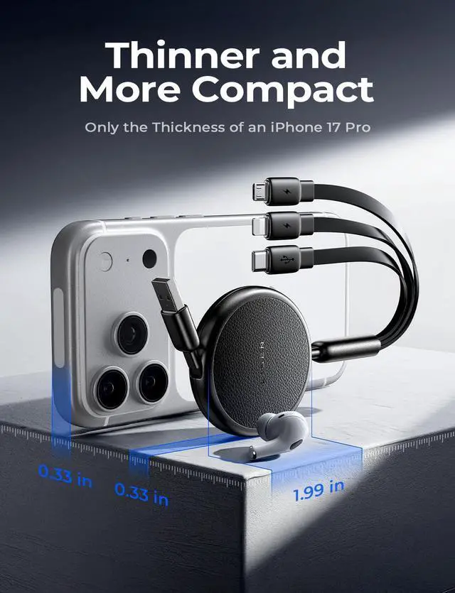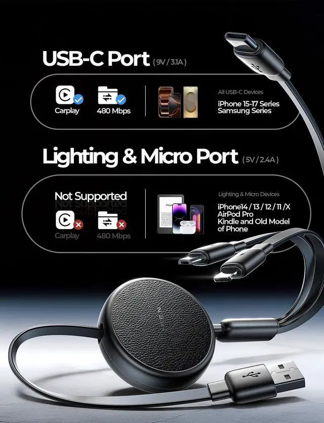 3 in 1 Retractable Car Charger Cord for All DevicesThe multi-charging cable allows you to charge all your devices effortlessly featuring a 3-in-1 retractable design with built-in USB-C(9V/ 3.1A ) Micro-USB(5V/2A) and iP connectors(5V/ 2.4A ). (USB-C Port use alone support both Charging & 480Mbps Data Transfer & Carplay Lightning port only supports charging) Ultra-Portable and Adjustable LengthLISEN smallest 3 in 1 retractable car charger cable offers four stretching lengths: 1.5 ft 2.36 ft 3.05 ft and 3.67 ft accommodating different daily scenarios. It supports pulling from both ends a single end or even a blind pull for ease of use. The retractable cord that is close in size to airpods can be easily stowed in a handbag laptop bag or pocket.