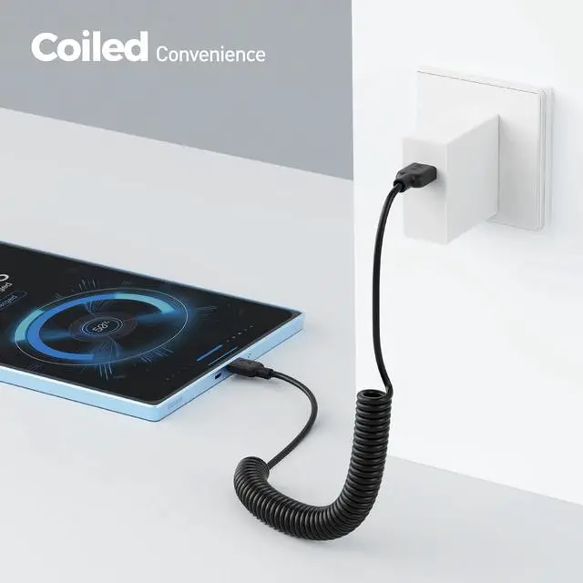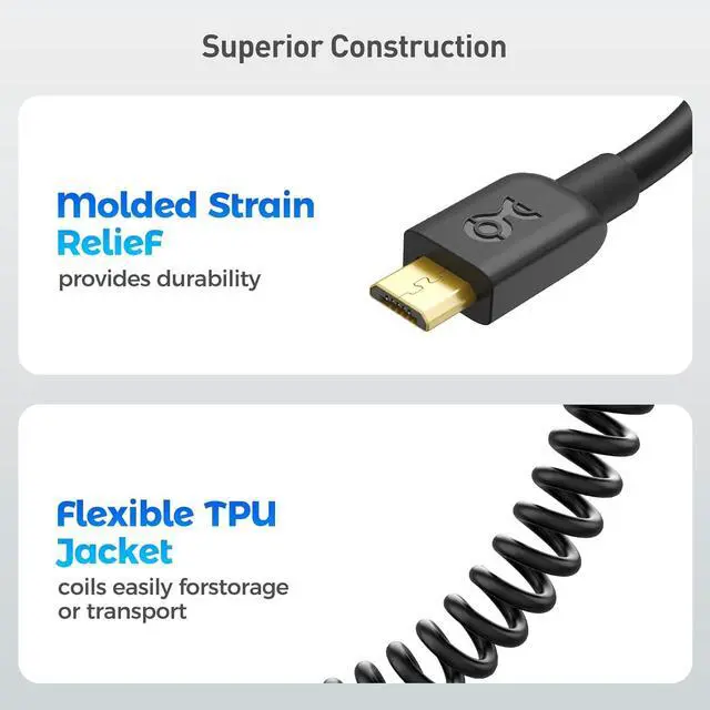 Charge & sync your mobile devices such as Android and Windows smartphones and tablets MP3 players E-readers handheld gaming consoles and more with the common Micro-B USB port; USB cable connects your device to a computer docking station USB hub external USB power bank wall charger or car chargerCoiled design provides the perfect length for connecting a smartphone to a car charger without having a tangled cable mess; Coiled flexible USB cable provides a snug fit with your device and stretches easily from around 1 foot to 3 feet or more after useCost-effective 2-pack of provides a lightweight extra that weighs less than 2 Ouncess for carrying in your accessory case when traveling; Dual function as a USB charging cable and a USB data sync cableDurable construction combines gold-plated connectors bare copper conductors and foil & braid shielding to provide superior cable performance and error-free data transmission; Supports Hi-Speed USB 2.0 data transfer rate up to 480 Mbps while offering backwards compatibility with USB 1.