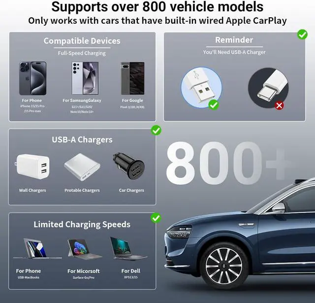 Charging: Carplay USB A to USB C Cord Supports a variety of fast charging protocols such as 2.4A QC 2.0 QC 3.0 QC4+ PE PD and PPS. Ensure safe charger speed up to 2A more suitable for iPhone 15 and and type-c port devicesWidely