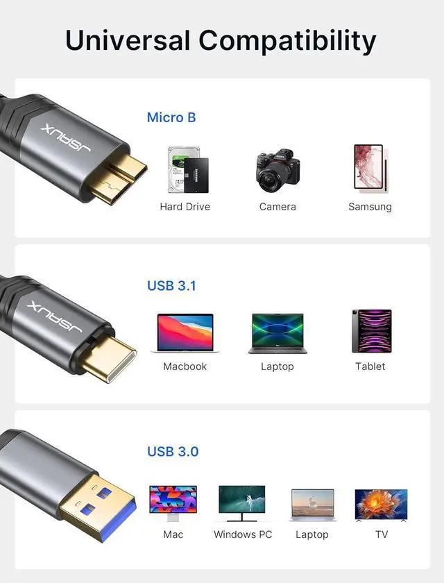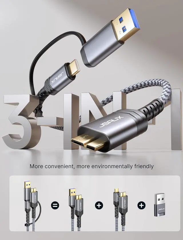 Quality: With Tangle-free Nylon Braided Design and 40000+ bend lifespan testing the SR anti-break design enhances the durability of the USB micro b external hard drive cord made of an aluminium case which offers superior thermal conductivity and enhanced safety compared to plastic. Unique gold-plated connectors also make data transmission more stable. Avoid transmission failure due to instability during fast transmissionWhat you get: It has Micro B to USB A/C External Hard Drive Cable 1.6FT in the pack