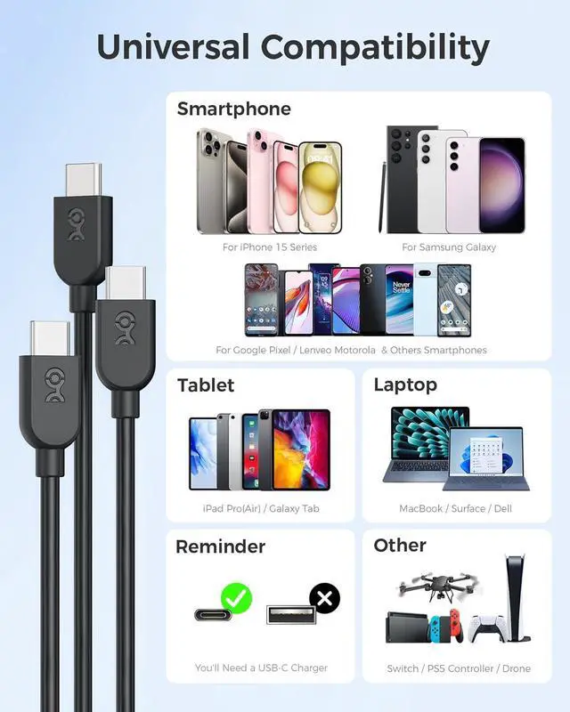 Charge: Connect laptops smartphones and tablets for ultra-fast USB-C charging with this 60W (20V 3A) USB C charger cable pack; This USBC to USBC cable pack supports up to 60W Power Delivery charging on compatible devices such as iPhone 15/15 Pro/15 Plus/15 Pro Max iPad Mini 6/ Pro 2021 iPad Air 4 Galaxy S23/S22/S21/S20/S10/S10+/S10e/S8/ S8+/ S9/ S9+/Galaxy Note 20
