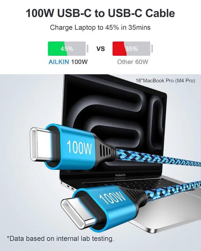 100W Super Fast Charger: AILKIN USB C to C Cable supports high-quality rapid charge up to 100W/5A and charges S24 to 89% in 35mins while the 60w cable can only charge to 60%. Charge MacBook Pro 16 to 45% in 35mins thats 58% faster than a 60W cable. transfer speeds up to 1Gbps. it can help you work efficiently and save more time.