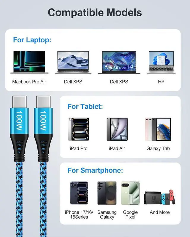 Universal Compatibility: The USBC to USBC Charging Cable Fast Charger is designed for Galaxy S26/S26 Ultra/S26+/S25 Ultra/S25+/S25/S24/S24 Ultra/S23/S23 Ultra/S22/S21/S20/Note 20/A17/A16/A15/A14/A56/A55/A36/A26 Google Pixel 10/9 Pro XL/9/8/8Pro/7/7Pro/6/6 Pro/5 iPhone 17/17Pro Max/Air/17e/16 Pro Max/16 Pro/15/15 Pro/15 Pro Max/15 Plus MacBook Pro 16''(2021/2020/2019)/MacBook Pro 15(2019/2018)/MacBook Pro 13''(2022/2020/2019)/MacBook Air 13''(2022/2020/2019) New iPad Pro/Air/Mini More USB Type-C Devices.