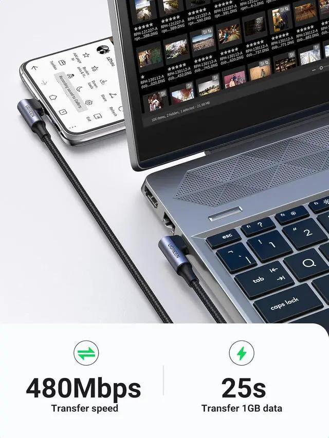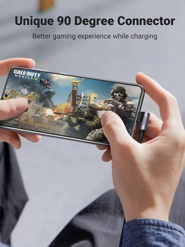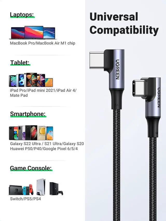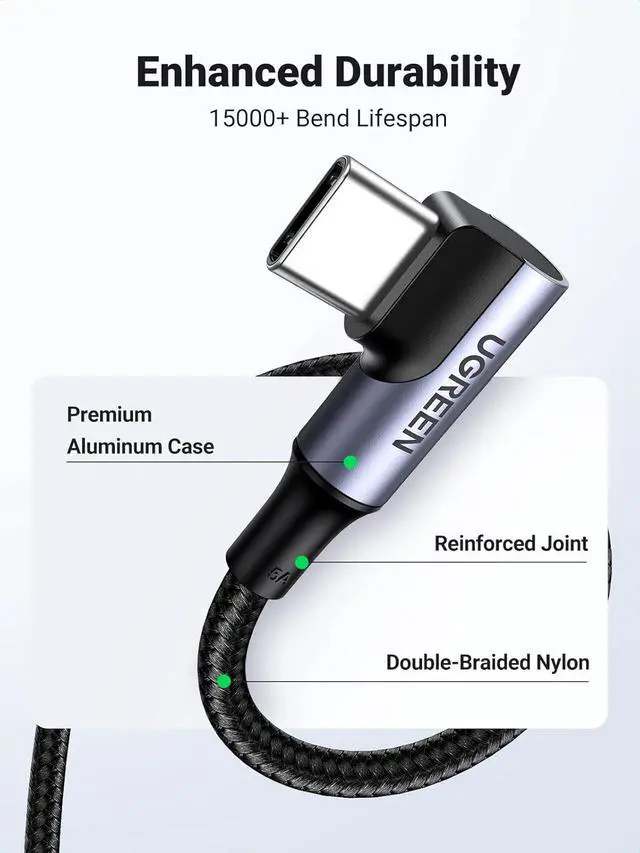 Unique Design: UGREEN USB-C to USB-C cable with an innovative 90 degree L design is much more convenient and more comfortable for playing games watching videos reading e-books while lying on the couch or bed while charging. [Max thickness of phone case allowed is 0.08 inch]100W
