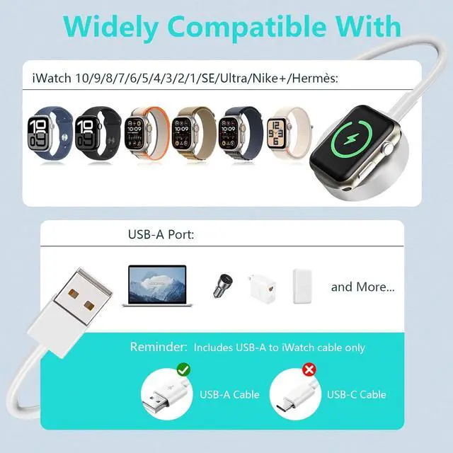 Wide Compatibility: Autallgee iWatch charger compatible with all Watch such as SE 2 SE Nike+ Hermès Series 10/9/8/7/6/5/4/3/2/1 including 38mm 40mm 41mm 42mm 44mm 45mm 46mm 49mm version.
