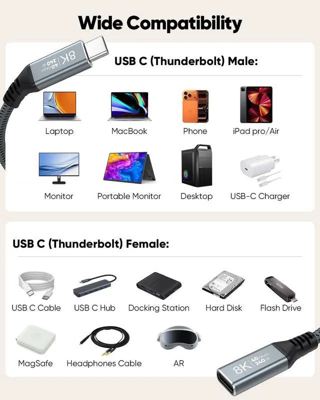 Compatibility: Type C Extension Cable is compatible with MacBook Pro/Air iPad Pro/Air iMac Pro USB C Hub Docking USB C Charger USB C Cable iPhone 17/16/15 Series Desktop Laptop Galaxy Pixel Monitor Portable Monitor Flash Drive MagSafe and more