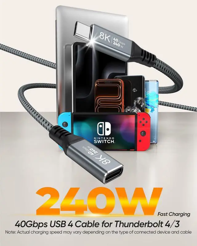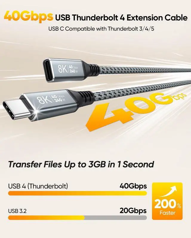 Ultra High-speed: This USB 4 extension cable supports data transfer speeds of up to 40Gbps which is 2 times faster than USB-C 3.2 (20G/10G) backs up 3GB files within 1 second. Perfect for Thunderbolt 4/3 USB C Hub Docking Station Hard Disk SSD and other usb4 devices. USB C Extension Cable is also compatible with Thunderbolt 5 and USB 3.2 / 3.1 / 3.0 / 2.0S upports 8K