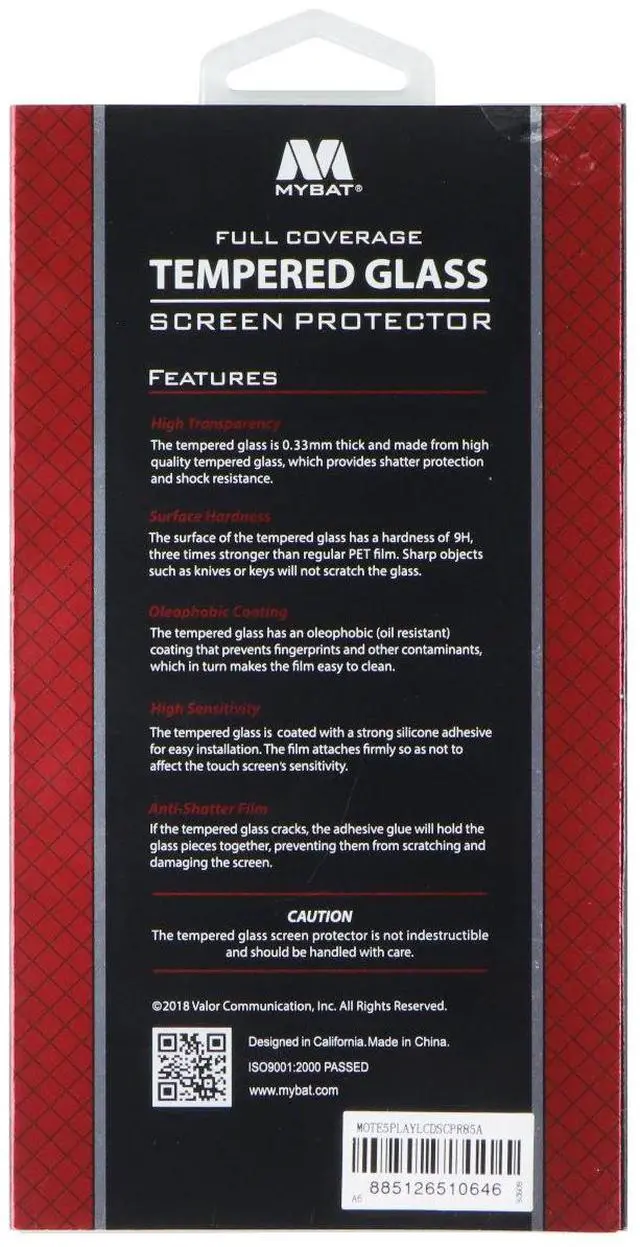 The Mybat Full Coverage 9H Tempered Glass for Motorola Moto E5 Play / E5 Cruise Smartphones.