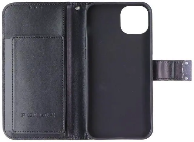 Features:Designed for Apple iPhone 15 PlusFolio wallet case with card and cash slotsDurable synthetic leather with sleek black finishBuilt-in stand for hands-free viewingMagnetic flap closure for added securityPrecise cutouts for full access to ports and camera