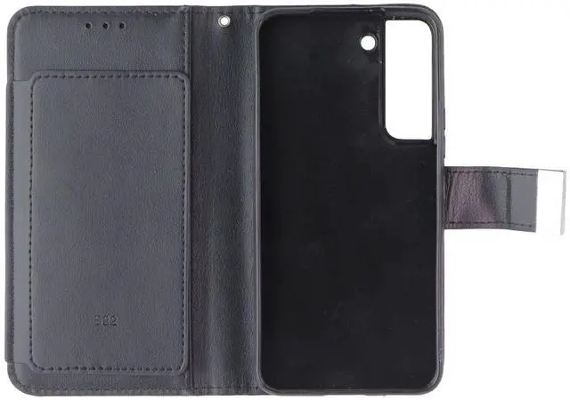 The Mybat MyJacket Wallet Case for Samsung Galaxy S22 Smartphones. Black Leather Version. Features:2-in-1 Wallet CaseCard SlotsMagnetic ClosureFoldable Stand