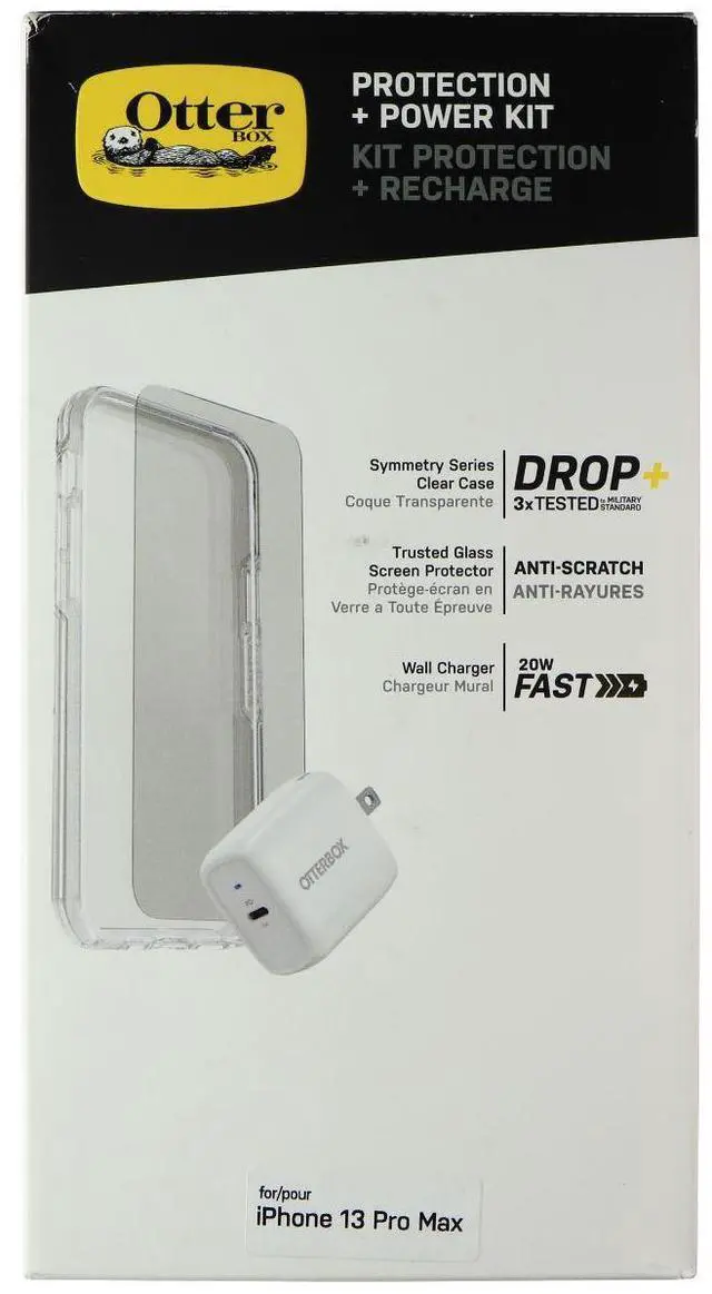OtterBox Protection + Power Kit for Apple iPhone 13 Pro Max, Clear Case, Glass, and White Adapter color.