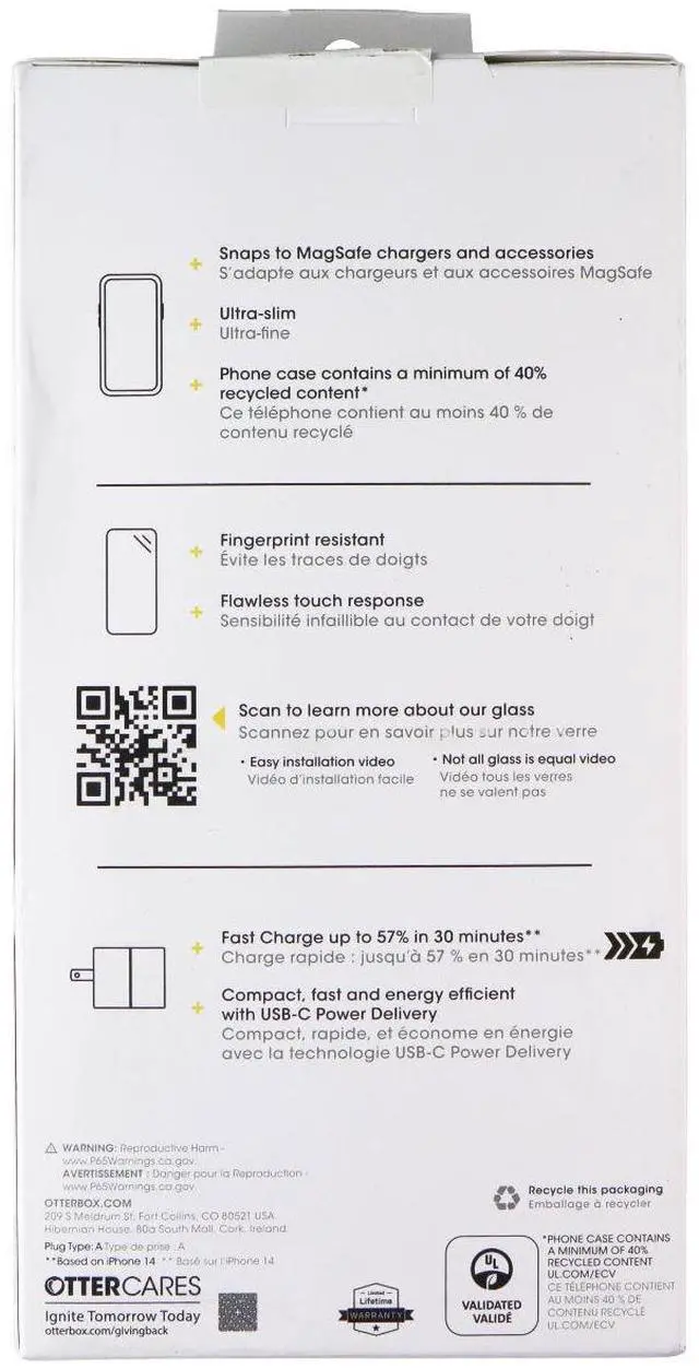 The OtterBox Protection + Power Kit (Case / Screen / Charger) for Apple iPhone 14 Plus. Clear Case and Screen Protector, White Charger.