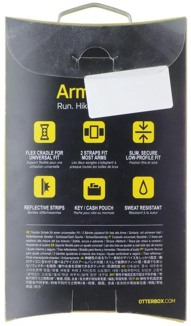 OtterBox brand products, A Universal Reflective Workout Armband for Smartphones. All Black finish with reflective strips. Flex cradle for universal fit. 2 straps fit most arms. Slim, secure low profile fit. Key and cash pouch. Sweat Resistant.