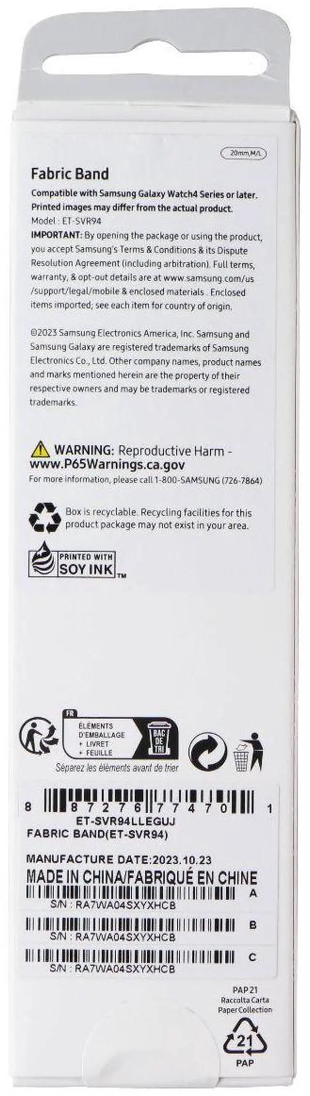 Features:ROUND-THE-CLOCK COMFORT: With its lightweight, comfortable design, the Fabric Band provides unrivaled comfort all day long; When it's time to sleep, rest easy knowing it will keep your Galaxy Watch6 securely on your wristREFECTIVE MATERIAL: The Fabric Band is made with reflective yarn that makes it easy to spot in the darkCLICK. SWAP. REPEAT: Refresh your look in an instant with a stylish new collection of bands for Galaxy Watch6 that release with just one click; Hold down the release button on the Fabric Band to remove it and swap it out for anotherGALAXY WATCH COMPATIBILITY: Compatible with Galaxy Watch4 Series or later (sold separately)