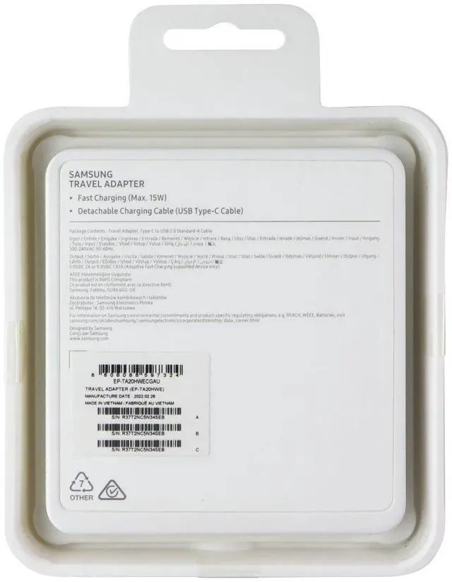 The Samsung (15W) Fast Charge Travel Adapter and USB-C to USB-A Cable. White version. Australian (AU) Plug. Features:Fast Charging (Max. 15W)Detachable Charging Cable (USB Type-C Cable)