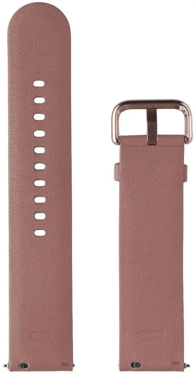 A Samsung 20mm Leather Band for Galaxy Watch Active2. Pink band color with metallic pink clasp color. Small adjusting strap.