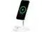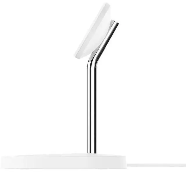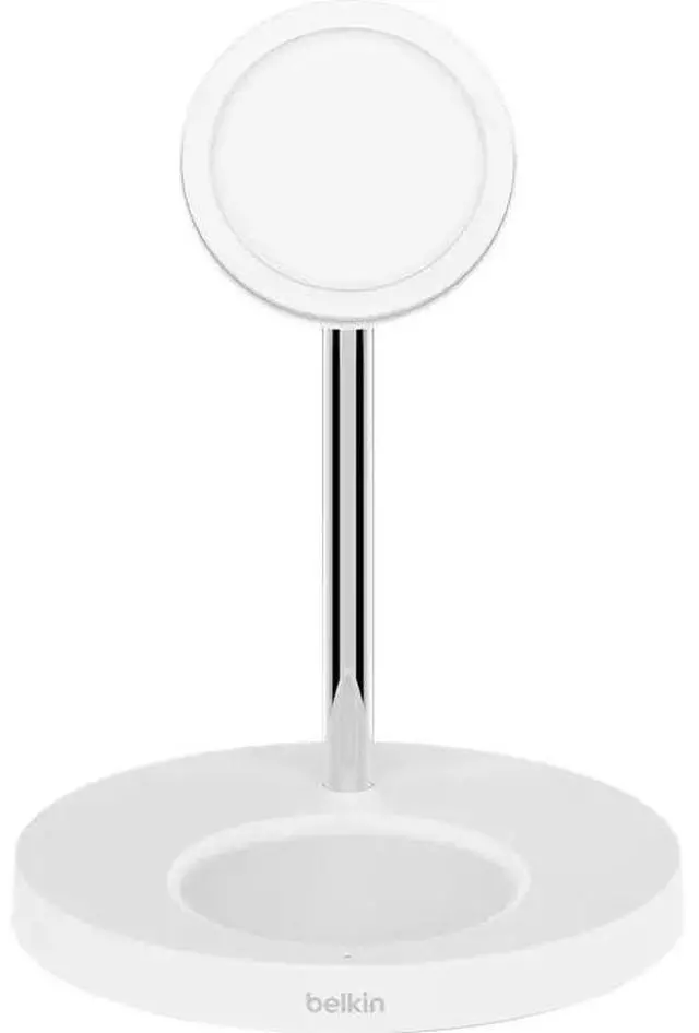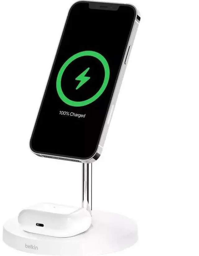 The Belkin WIZ010TTWH-TL (BoostCharge Pro 2-in-1) is a MagSafe-compatible wireless charging stand for iPhones (12, 13, 14, 15 series) and AirPods, delivering up to 15W to the iPhone and 5W to AirPods simultaneously, featuring a sleek design, LED status light, portrait/landscape charging, and included 36W USB-C power adapter. It offers a secure magnetic connection for seamless charging.
