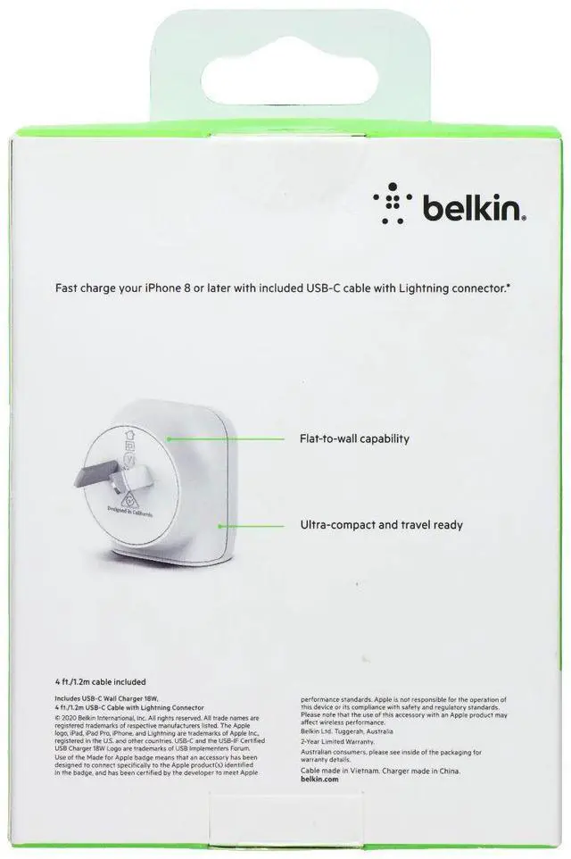 The Belkin 18W USB-C Wall Charger & USB-C to 8-Pin Cable. White Version. Please Note: This charger is of the AUSTRALIAN form factor. Features:Charges 0-50% in 30 MinutesUltra CompactClean White Design4 Ft Cable included