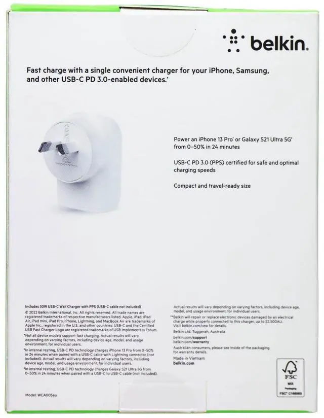 The Belkin BoostCharge 30W USB-C Wall Charger. White Version. Model: (WCA005AUWH). Please Note: This Charger is of the Australian Form Factor. Features:30WUSB-COptimized for iPhone & SamsungFast Charge Power Delivery