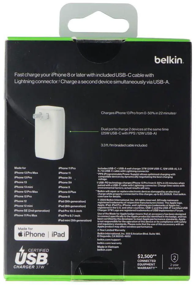 The Belkin BoostCharge 37W Dual USB-C/USB-A Wall Charger with USB-C to 8-Pin Cable. White Version.
