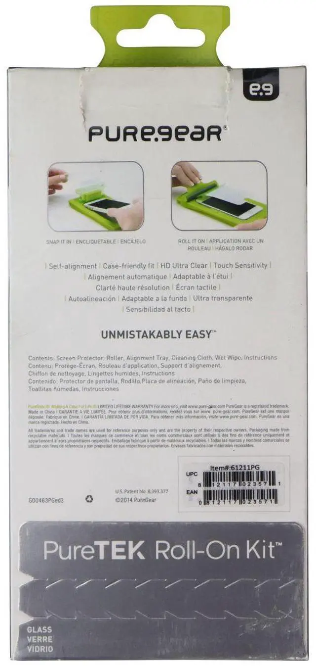 Self-alignment Bubble-free Case-friendly fit Snap it in and roll it on system Includes screen protector, roller, alignment try, cleaning cloth and instructions Use again with PureTek Roll-on Refills Ultra thin HD clear glass 9H hardness Shatter-proof Instant bubble-free appearance Case friendly fit Lifetime warranty