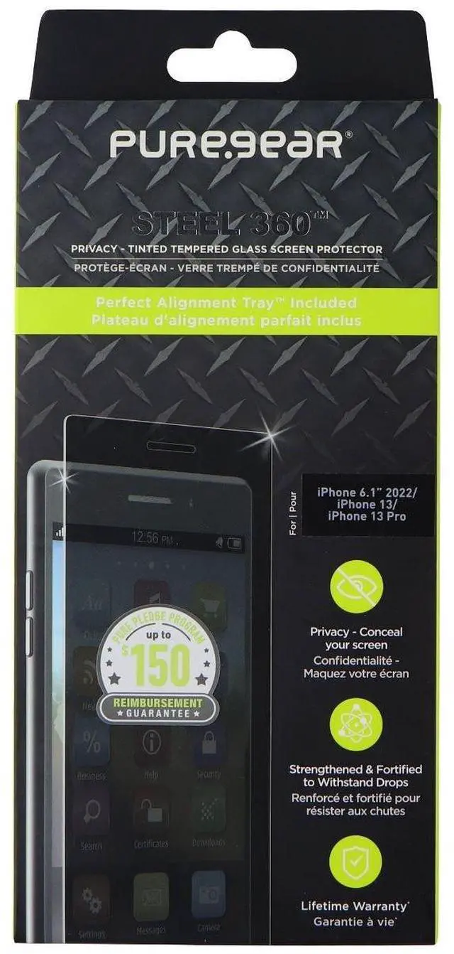 PureGear Steel 360 Privacy Tinted Tempered Glass for iPhone 14, iPhone 13, and iPhone 13 Pro Smartphones.