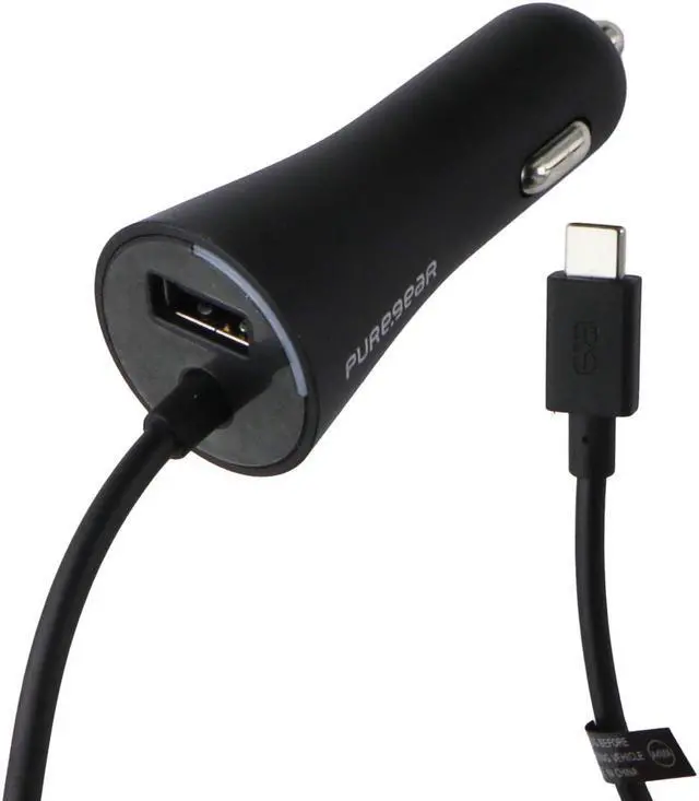 PureGear 24W Car Charger with 7-Ft USB-C Connector + Extra USB Port. Black version.