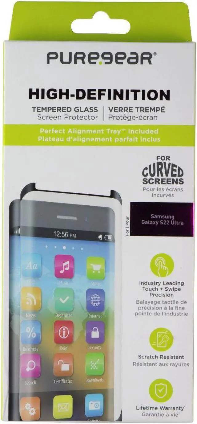 The PureGear High-Definition Tempered Glass w/Alignment Tray for Galaxy S22 Ultra. Clear version. Features: - Shatterproof and scratch-resistant tempered glass- Easy installation- Designed to fit perfectly on your device