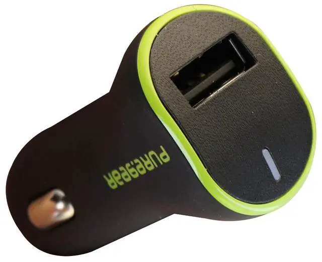A 12W Extreme USB Car Charger with Qualcomm Quick Charge 2.0 capabilities made by PureGear brand products. Black finish with small green trim. Universally compatible with any cable featuring a standard USB connector.