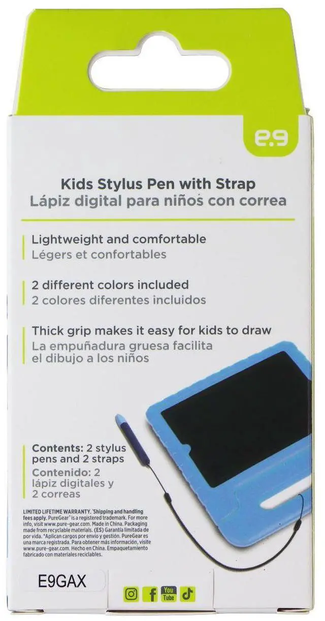 Features:Kid-Friendly Design: Made with soft silicone that's gentle on little hands and safe for all ages. Perfect for smooth drawing or writing on tablets without scratching or damaging the screen.Universal Compatibility: Compatible with a wide range of touch screen devices including iPads, Tablets, Kindles, iPhones, and more.Anti-Rolling Design: Features a unique triangular and ergonomic shape that prevents it from rolling off desks and makes it easy for kids to grip and use.Anti-Lost Tether: Includes two tether strap, perfect for attaching the stylus to a tablet so it's always within reach and never gets lost.Package Includes: 2 Kids Stylus (1 Blue & 1 Purple), and 2 Anti-Tether Straps