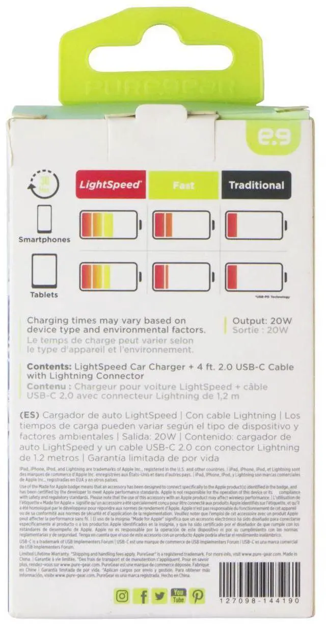 The PureGear Light Speed 4 Foot USB-C to 8-Pin Cable and 20W Car Charger. White Version.