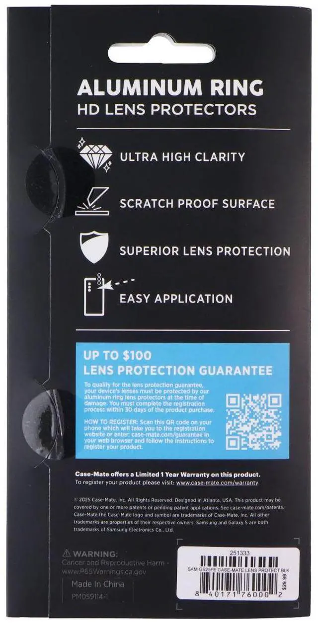 The Case-Mate Aluminum Ring HD Lens Protectors for Samsung Galaxy S25 FEKEY_TAB Smartphones. Features:Ultra High ClarityScratch Proof SurfaceSuperior Lens ProtectionEasy Application