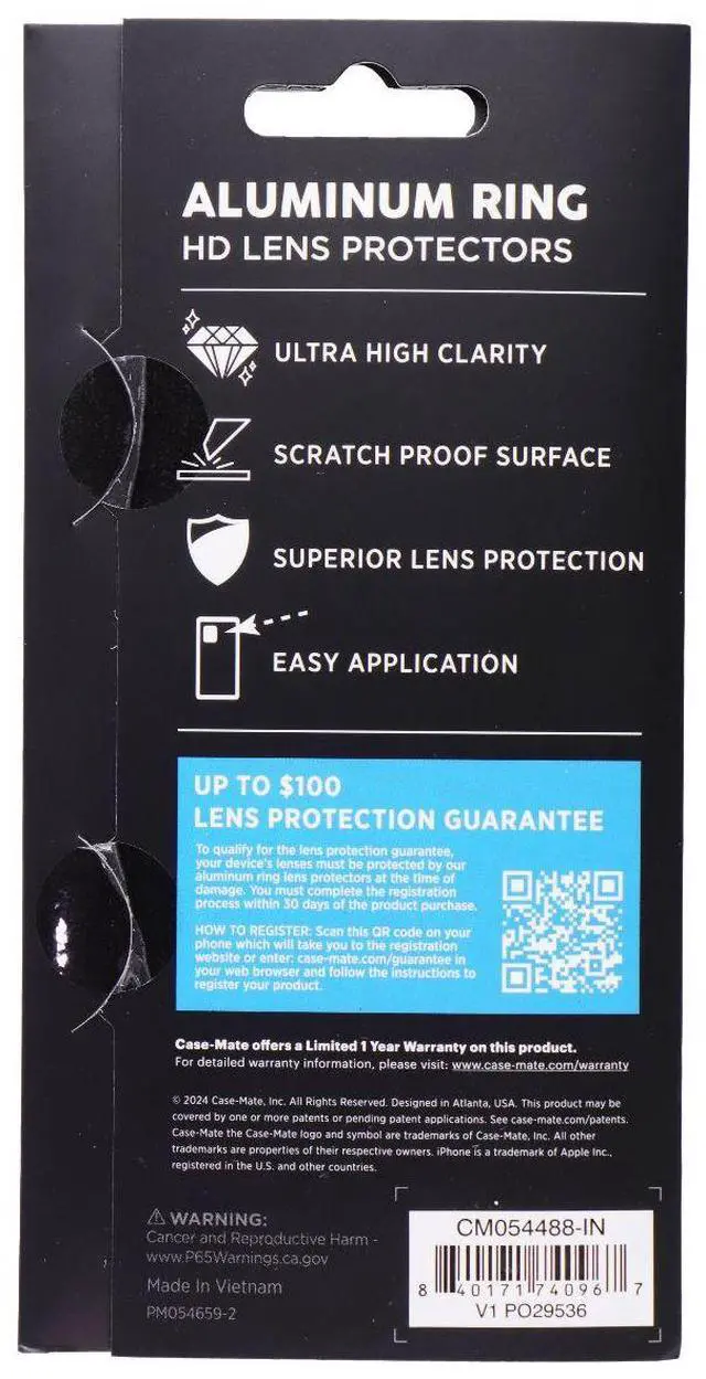 Case-Mate Aluminum Ring HD Lens Protectors for iPhone 16 and 16 Plus Smartphones. Black lens protector color. Features:Ultra high clarityScratch proof surfaceSuperior lens protectionEasy application