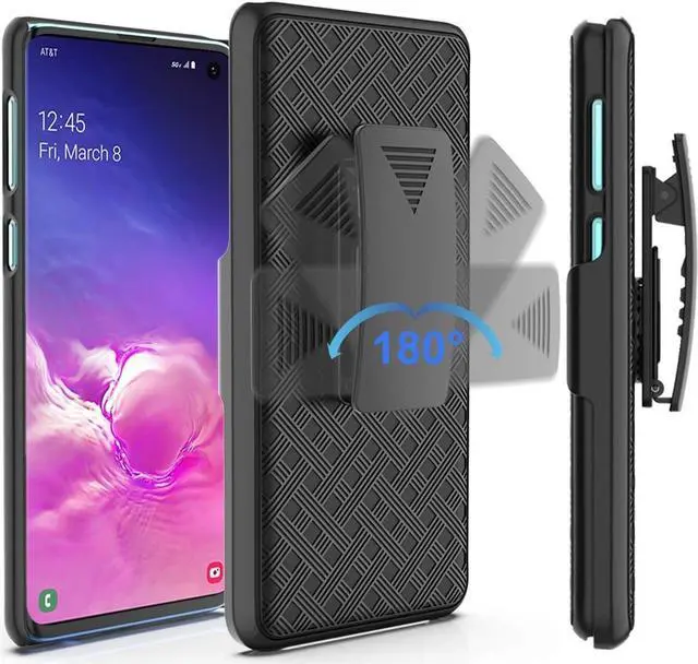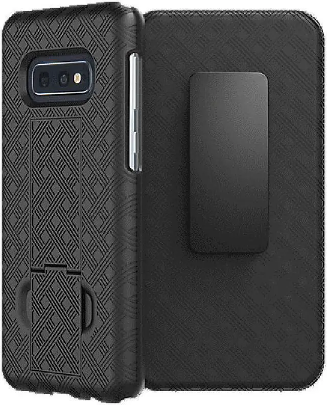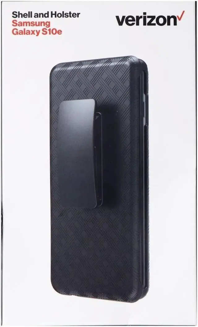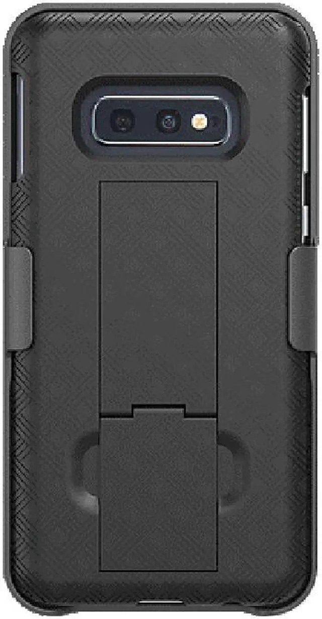 PRODUCT OVERVIEWThe Shell Holster Combo provides protection and convenience for your Samsung Galaxy S10e. Defend against scrapes, dirt, and daily wear and tear with the rubberized shell. Enjoy convenient portability using the holster. A pivoting 180-degree belt clip allows for a secure attachment and comfortable positioning. Clip it to your belt, purse strap or backpack. And get an extra-secure grip on your Galaxy S10e using the case's rubberized texture. KEY FEATURES2-in-1 carrying solutionPeace-of-mind protectionHandset accessibilityFixed 180-degree ratcheting belt clipDurable industrial-grade plasticBlack rubberized crisscross textureMicrosuede liningFoldout kickstand
