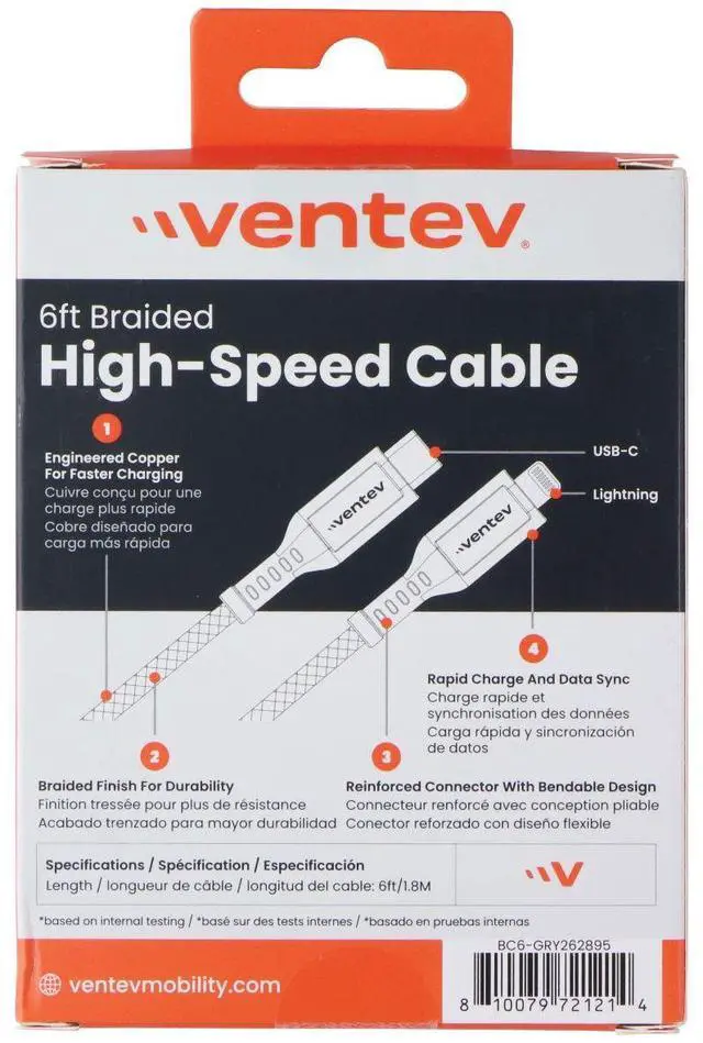 The Ventev (6-Foot) USB-C to 8-Pin Braided High-Speed Cable. Black and Gray finish.