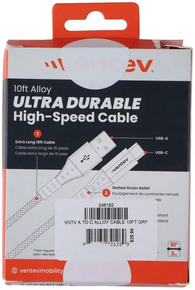 Ventev 10 Foot Alloy USB-A to USB-C Ultra Durable High Speed Cable - Gray
