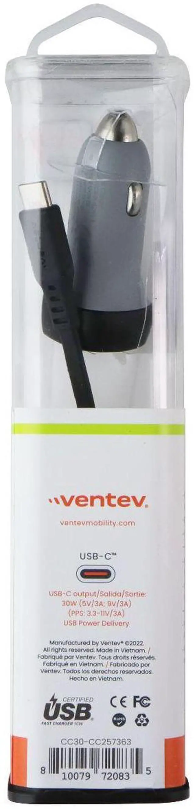 The Ventev (30W) USB-C Car Charger + Cable (USB-C to USB-C). Gray and Black finish.