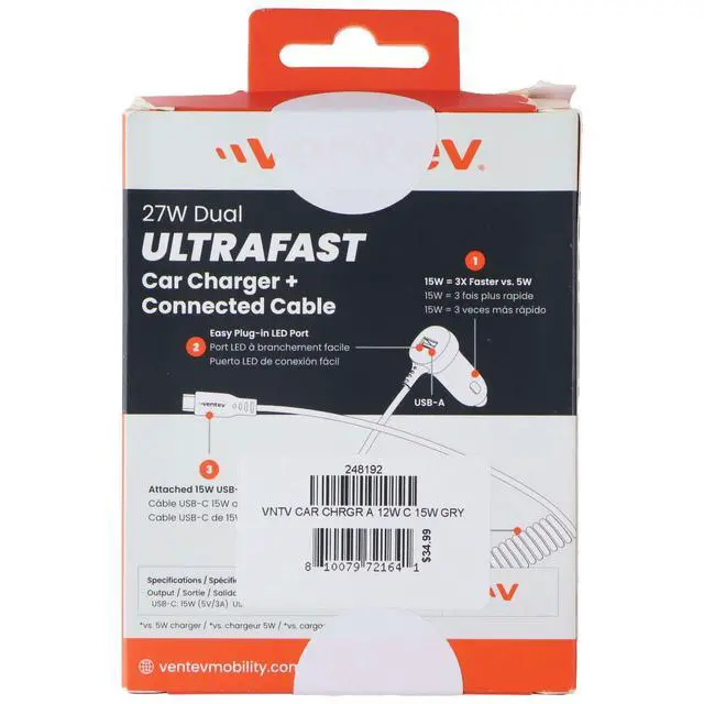 Features:15W Charging that is 3x Faster than a Standard 5W ChargerCharge 2 Devices Simultaneously15W USB-C Cable12W Universal USB-A PortCoiled Travel Cable - Ideal for use in the Car