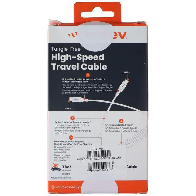 The Ventev USB-C to USB-C Expandable Tangle Free High Speed Travel Cable. Gray Version. Features:2 Feet - Expandable to over 3 FeetRapid ChargeReinforced Connector