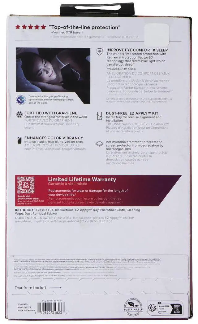 The ZAGG Invisible Shield XTR4 Screen Protector for Apple iPhone 16 Plus / 15 Plus Smartphones. Features:Graphene FortifiedBlue Light FiltrationEnhances Color VibrancyDust-Free EZ Apply Kit