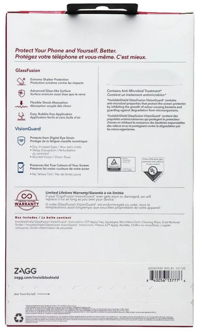 Features:Extreme Shatter Protection: 4X stronger than the traditional glass screen protection.*Protective Eyesafe Layer: Filters harmful high-energy visible (HEV) blue light which can contribute to digital eye strain.No Yellow Tint: The Eyesafe layer filters harmful blue light without distorting the color performance of your screen display. Clean, Smudge-free Screen: ClearPrint technology, exclusive to InvisibleShield, makes fingerprints virtually invisible.Maximum Scratch Prevention: Ion exchange technology increases surface compression for increased hardness and scratch-resistance.Reinforced Edges: Reinforced edges prevent chips and stop cracks from starting and spreading.